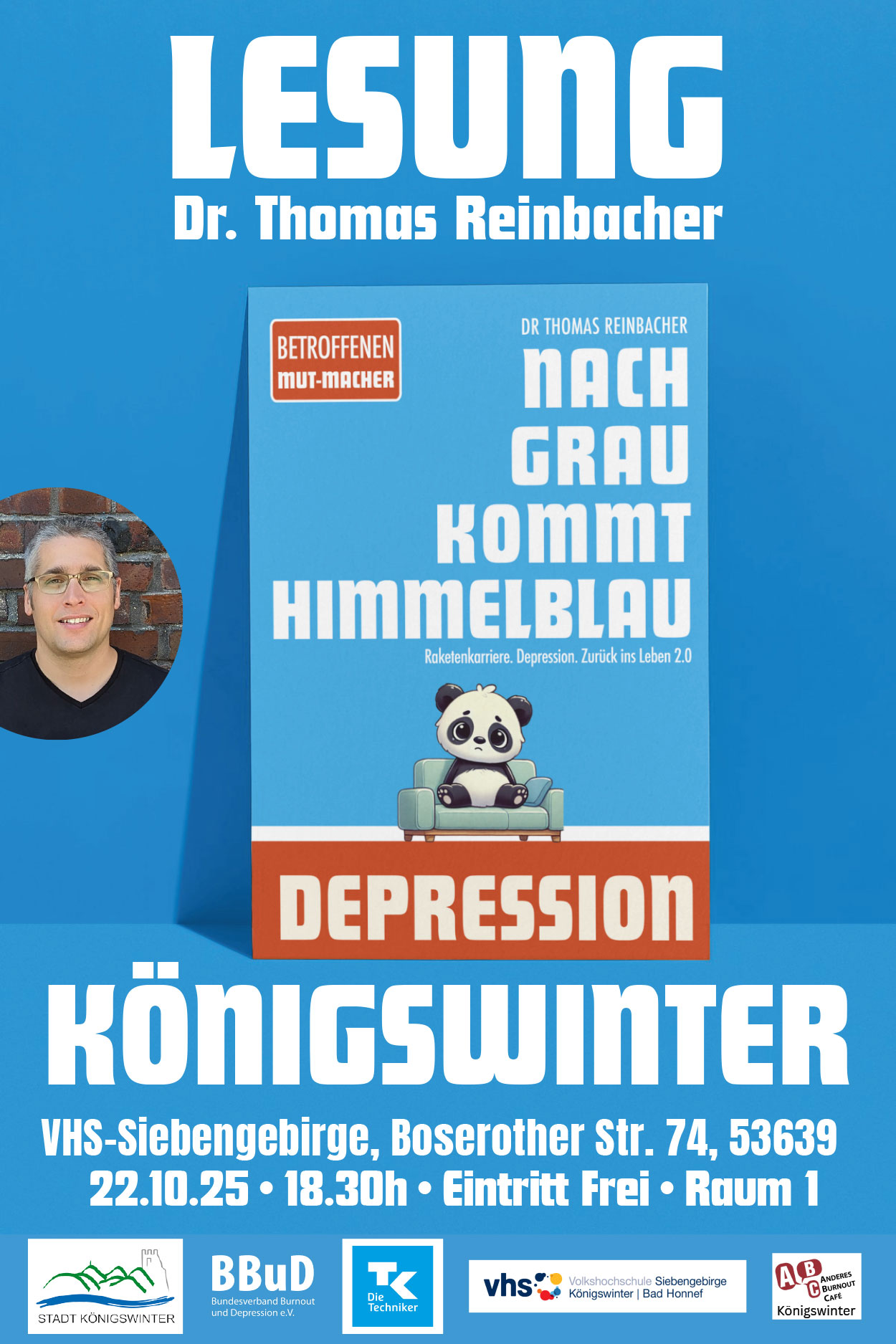 Auf Wunsch wird Dr. Thomas Reinbacher einzelne Passagen aus seinem Buch lesen, Verständnis dafür aufzeigen, wenn die eigene Psyche zum größten Gegner wird, die Fragen des Publikums zu diesem Tabuthema beantworten, hilfreiche Signale und Herangehensweisen aufzeigen und wie der Weg zurück ins Leben gelingen kann. Der Eintritt ist frei, um Anmeldung wird gebeten unter kontakt@vhs-siebengebirge.de