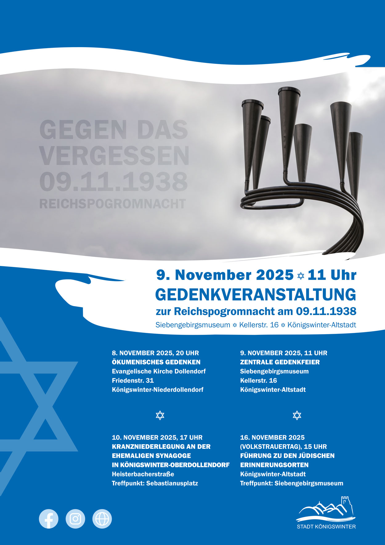 Am Montagnachmittag, den 10. November um 17 Uhr wird auf dem Sebastianusplatz und am Gedenkstein für die ehemalige Synagoge an der Heisterbacher Straße 116 in Oberdollendorf mit einer Kranzniederlegung durch Bürgermeisterin Heike Jüngling den Opfern gedacht.