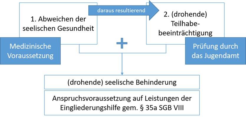 Das Abweichen der seelischen Gesundheit wird durch eine ärztliche Diagnostik nachgewiesen. Die Überprüfung einer Teilhabebeeinträchtigung in den Bereichen Alltag, Familie, Freizeit und/oder Schule ist Aufgabe des Jugendamts. Hiervon spricht man, wenn z. B. keine altersgemäße Selbstständigkeit entwickelt werden konnte, keine altersgemäßen sozialen Kontakte bestehen und/oder die Entwicklungsmöglichkeiten deutlich eingeschränkt sind.