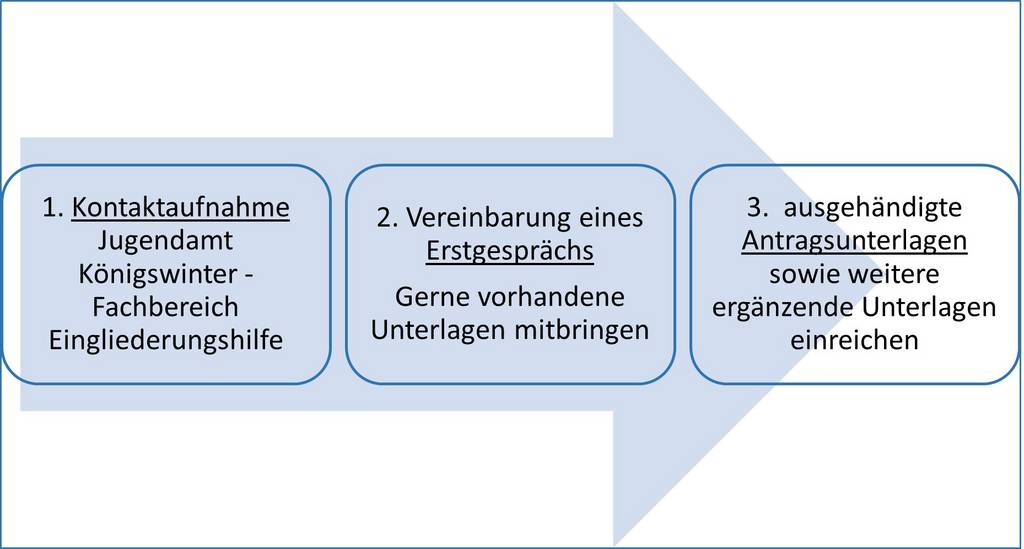 In einem Beratungs-/Erstgespräch werden Ihnen u. a. die Voraussetzungen für eine Leistung der Eingliederungshilfe und der Prüfprozess erläutert. In diesem Gespräch erhalten Sie auch die Antragsunterlagen.