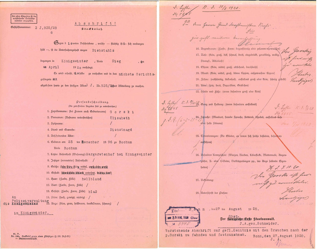 Dieser Steckbrief ist ein Beispiel dafür, wie eine gesuchte Person zur Fahndung ausgeschrieben wurde. Die begangene Tat ist auch die häufigste: Diebstahl. Taschendiebstähle waren in Königswinter aufgrund des hohen Touristenaufkommens relativ häufig.