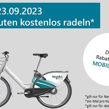 Während der Europäischen Mobilitätswoche vom 16. September bis zum 23. September 2023 in der Nextbike App zur Nutzung der RSVG-Bikes registrieren und mit dem Code MOBILITY2023 30 Freiminuten erhalten! Der Gutscheincode ist für Neukunden einlösbar, gilt für konventionelle Räder, ein Mal pro Konto und nur für das erste Fahrrad.