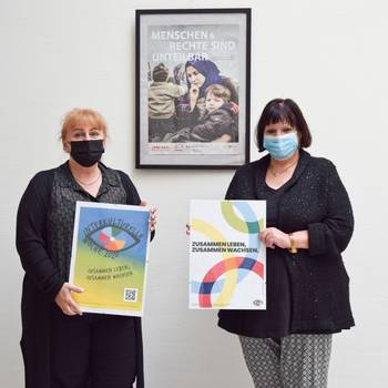 Sabine Bembenek von der Stabsstelle Integration sowie Hildegard Walter, Geschäftsbereichsleiterin Soziales & Generationen freuen sich sehr, die Interkulturelle Woche mit der Ausstellung „Menschen und Rechte sind unteilbar“ von ProAsyl eröffnen zu dürfen.