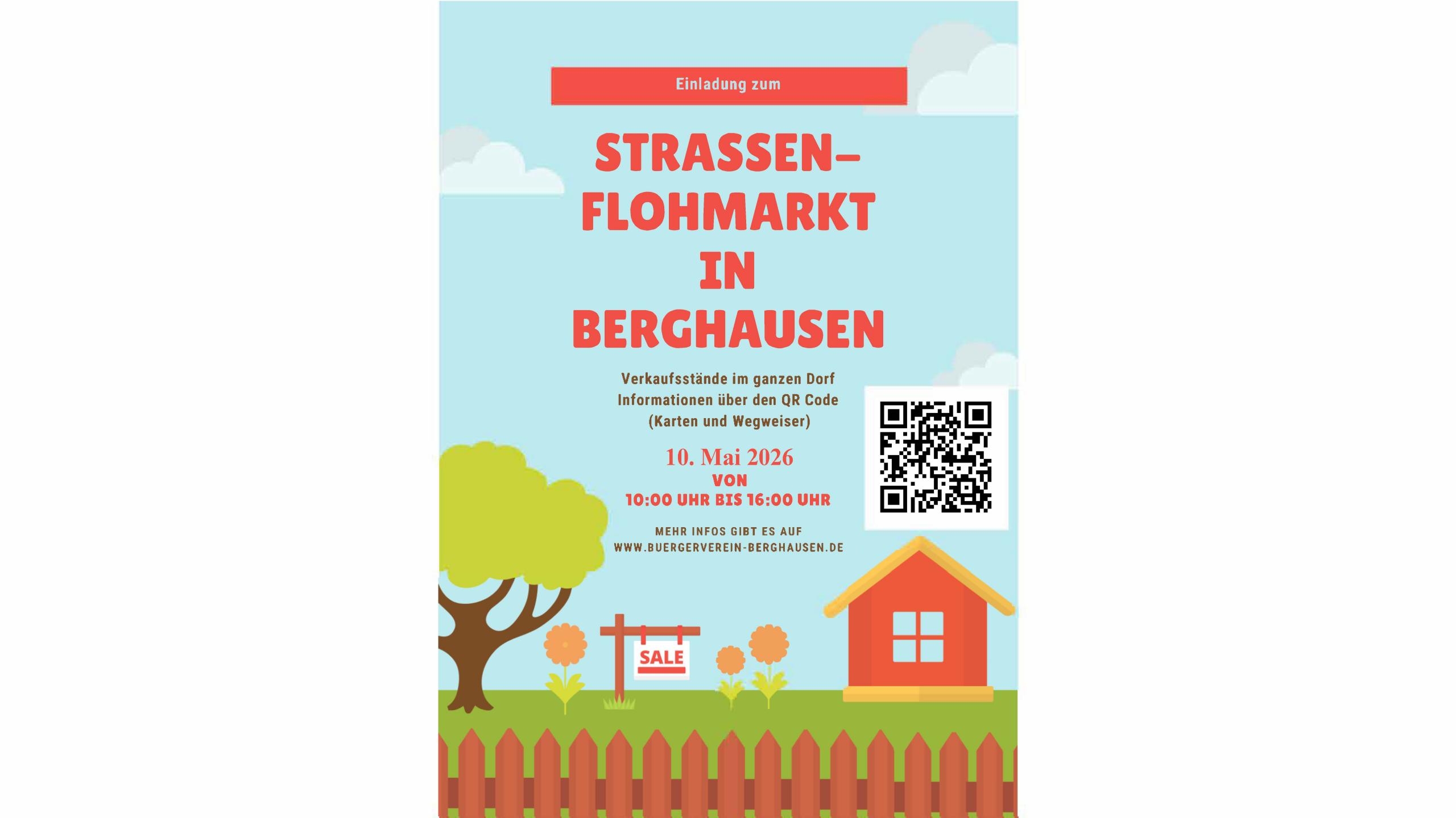 Am 10. Mai von 10-16 Uhr findet in Berghausen wieder ein Straßenflohmarkt statt. Ein Lageplan sowie Verkaufsartikel können mit Hilfe eines QR Codes oder über die Homepage des Bürgervereins abgerufen werden. Auf dem Dorfplatz wird die Elterninitiative Sandkasten e.V. Kuchen anbieten.